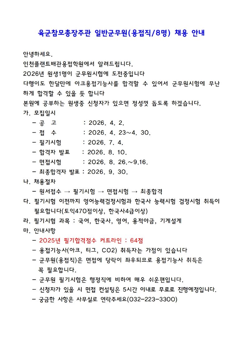 군무원 취업전문 학원 페이지 정보 작성자 관리자 댓글 0건 조회 44회 작성일 26-04-04 08:25 본문 안녕하세요.인천플랜트배관용접학원에서 알려드립니다.2026년 원생1명이 군무원시험에 도전중입니다다행이도 한달만에 아크용접기능사를 합격할 수 있어서 군무원시험에 무난하게합격할 수 있을 듯 합니다본원에 공부하는 원생중 신청자가 있으면 정성껏 돕도록 하겠습니다. 목록 다음글설비보전기사 용접부분 실기수강생 수시모집 25.09.17 댓글목록 댓글목록 등록된 댓글이 없습니다.